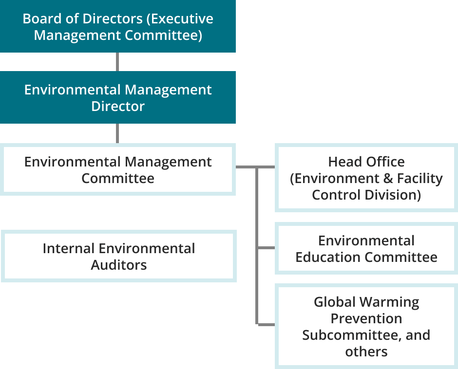 Recognizing environmental protection activities as a high-priority management challenge, we promote Environmental Management with the following framework. We have the Environmental Management Committee as a body for deliberating and deciding on environmental protection activities. Environmental Management Director oversees this committee. We have also established one committee and five subcommittees under the umbrella of this committee, which promote specific environmental activities.